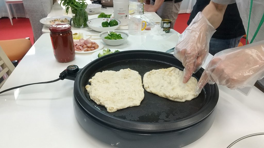 ホットプレートを180度に温めて、オリーブオイルをひいて生地を伸ばします。
