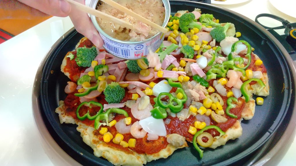 ひっくり返したら、ピザソースをたっぷり塗って、トッピングの材料とチーズをのせたら蓋をしてチーズが溶けたら出来上がり!